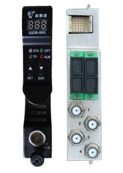 The GSOR-RRX-04 is a CATV Return Path Receiver Module with four optical inputs. The module is implemented by a low noise PIN diode and a high output level RF amplifier. The module features four independent RF out-put ports, which are located on the rear panel of the receiver module, providing up to 45dBmV output level. Monitoring and configuration setting of the receiver module are all achieved via the front panel and GSOR-EMS equipment management module.